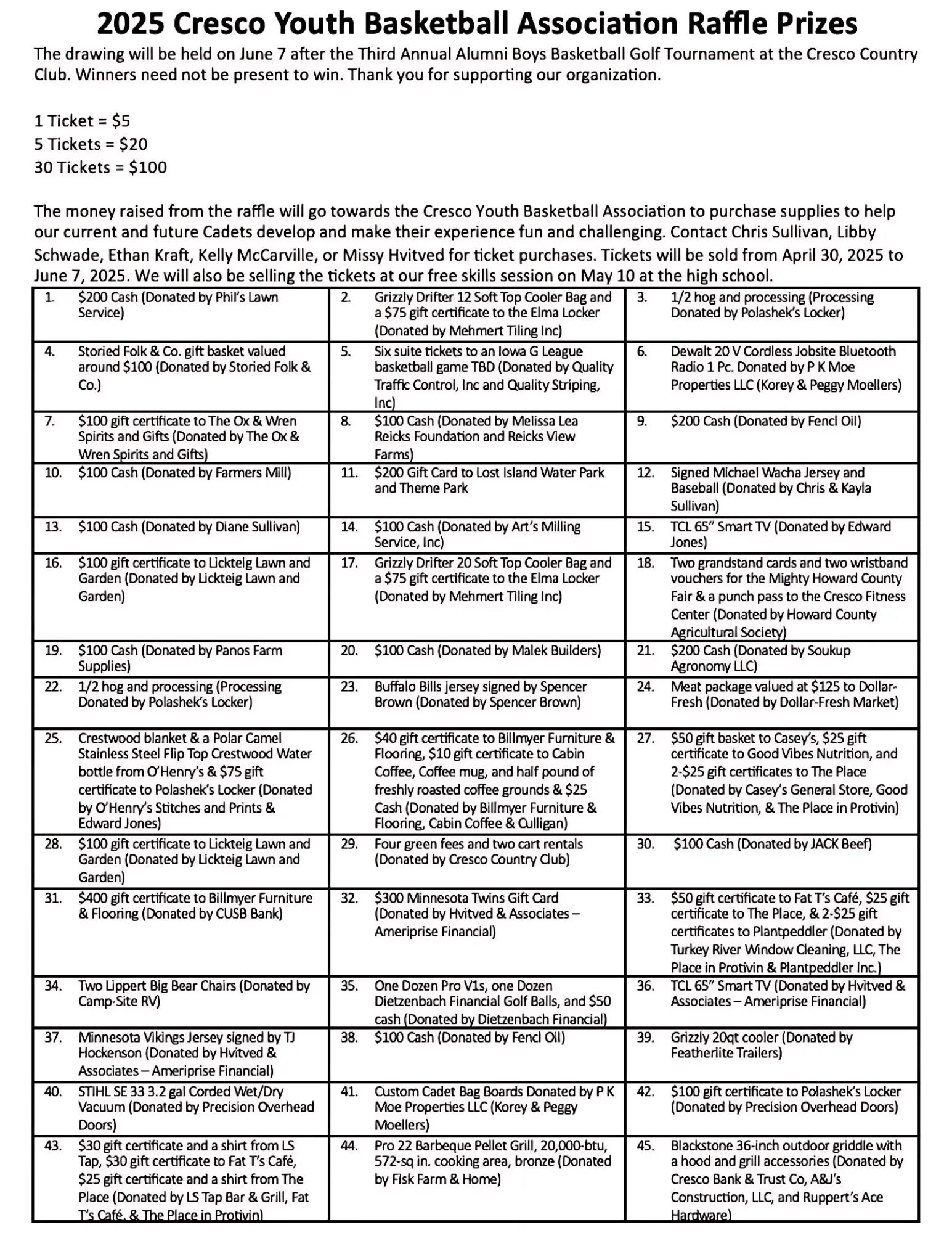 Saturday, June 7th is the 4-person best shot CHS basketball alumni golf tournament. Registration is open at 8:15am with a 9am start. Contact Sully for more information at 641.330.8480 or Kelly at 319.240.9086.