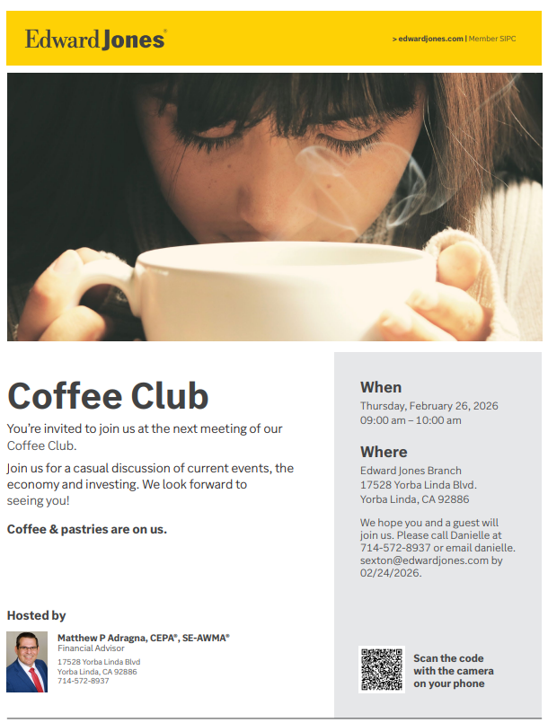 Join us for a casual discussion of current events, the economy and investing. We look forward to seeing you!