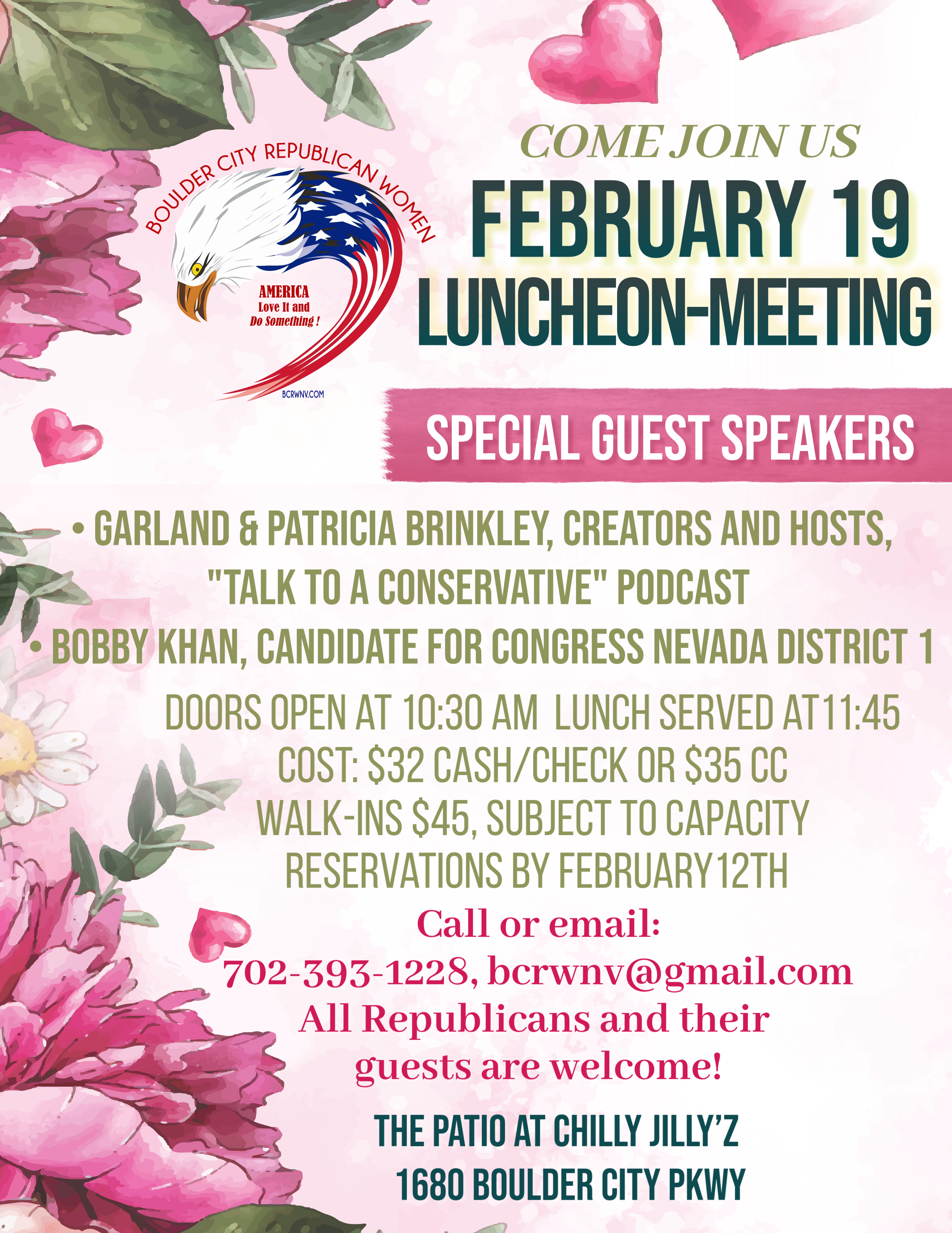Boulder City Republican Women will hold its monthly Luncheon-Meeting on Thursday, Feb.19th. Special guest speakers: Garland & Patricia Brinkley, Creators and Hosts, "Talk to a Conservative" podcast and Bobby Khan, Candidate for Congress Nevada District 1. Doors open 10:30 am, lunch served 11:45. Call or email: 702-393-1228, bcrwnv@gmail.com. RSVP by Feb.12th. Cost: $32 cash/check or $35 CC. Walk-ins $45, subject to capacity. All Republicans and their guests are welcome!