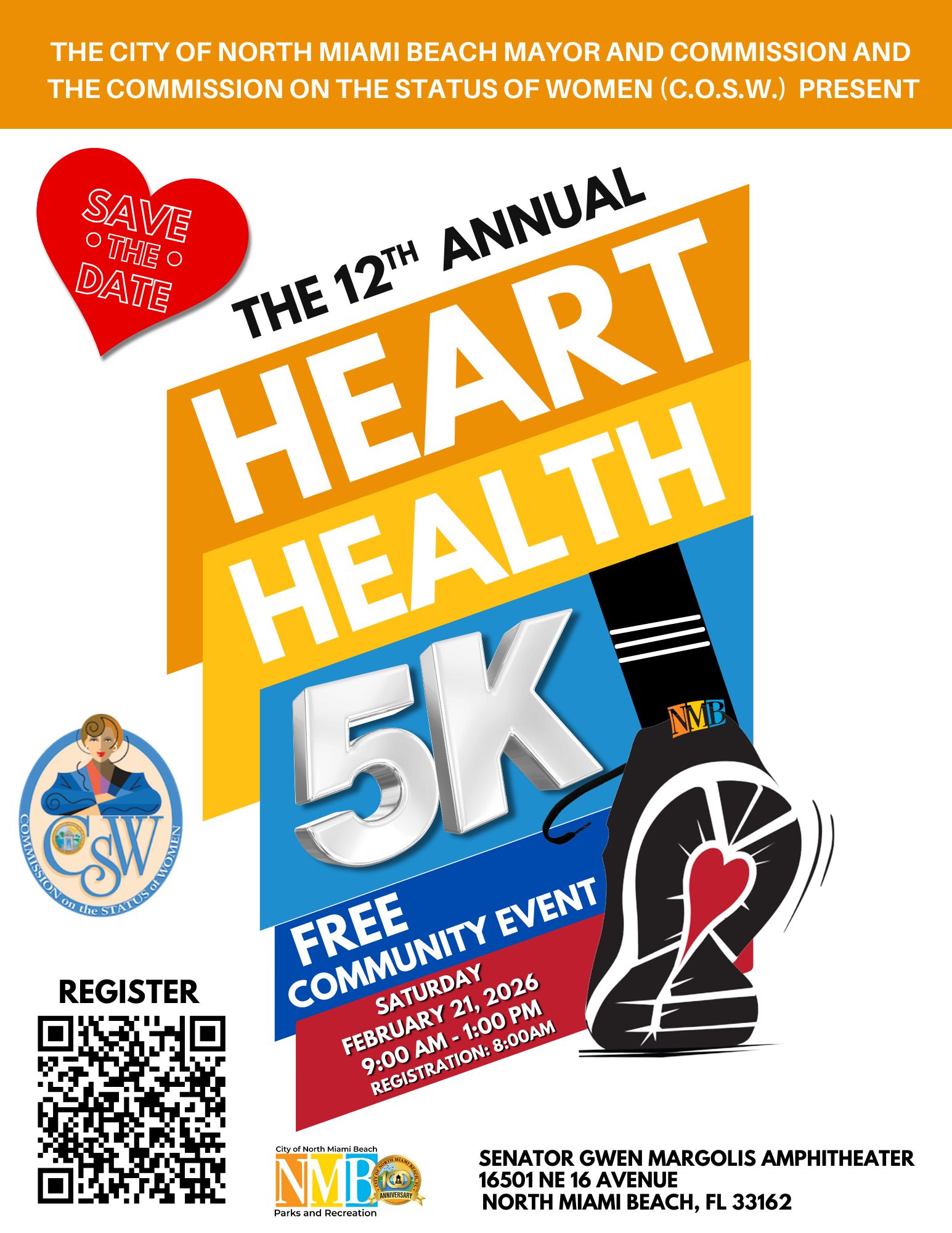 Join us for the 12th annual Heart Health 5K Walk/Run presented by The City of North Miami Beach Mayor and Commission and the Commission on the Status of Women. Mark your calendars for Saturday, February 21, 2026, from 9 a.m. to 1 p.m. at the Senator Gwen Margolis Amphitheater. Registration opens at 8 a.m., so be sure to arrive early to secure your spot for this heart-healthy event.