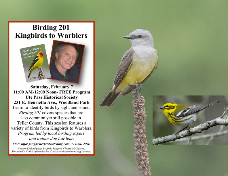 Birding 201 covers species that are less common yet still possible in Teller County. This session features a variety of birds from Kingbirds to Warblers.