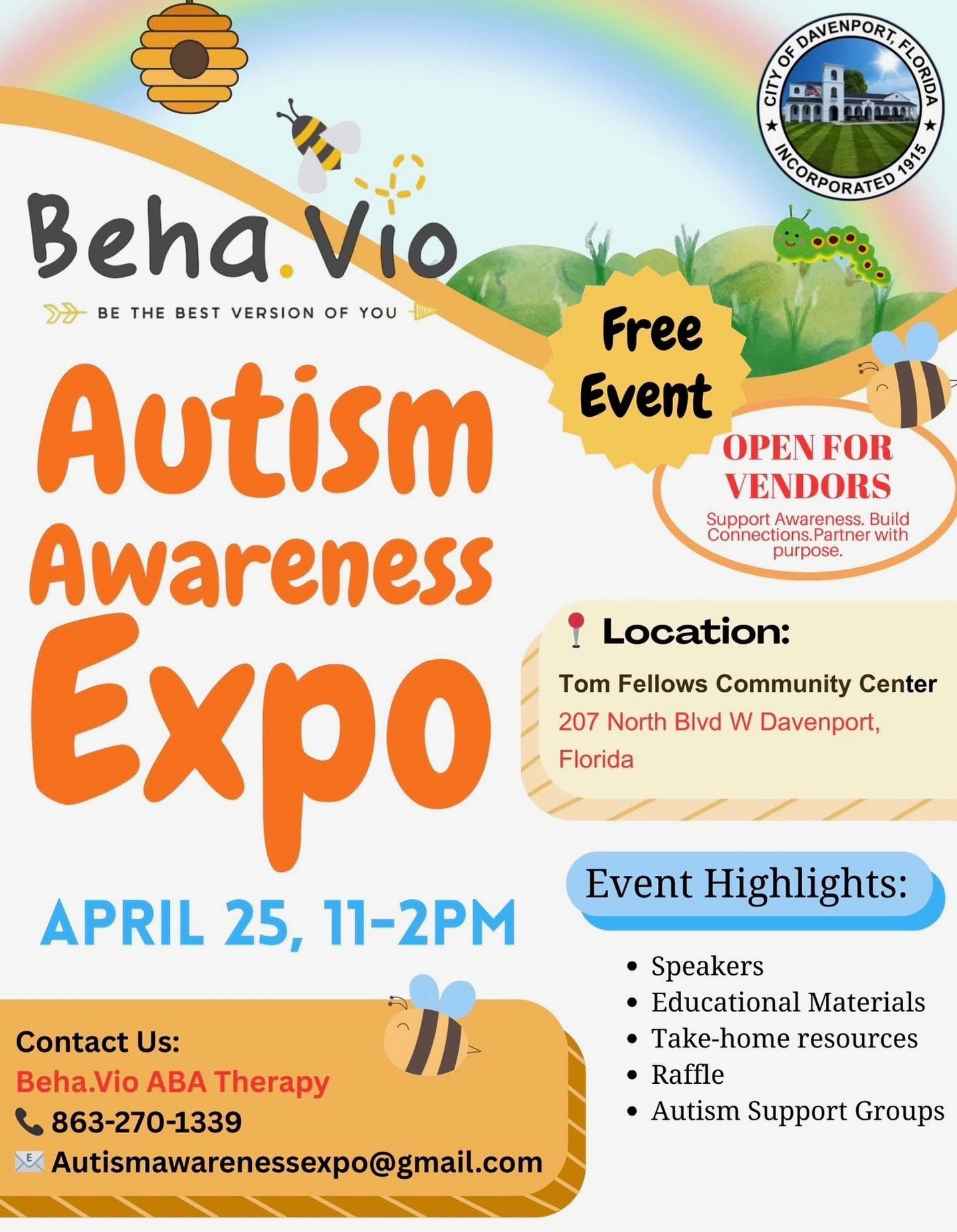 Autism Awareness Expo - Saturday, April 25th, 11 a.m. - 2 p.m. - Tom Fellow Community Center, 207 North Blvd. W, Davenport, FL - FREE Event - Open for Vendors - Call 863-270-1339. Chamber Members participating in the event: On Time With Care Transport; City of Davenport. Click HERE for the flyer and more info.