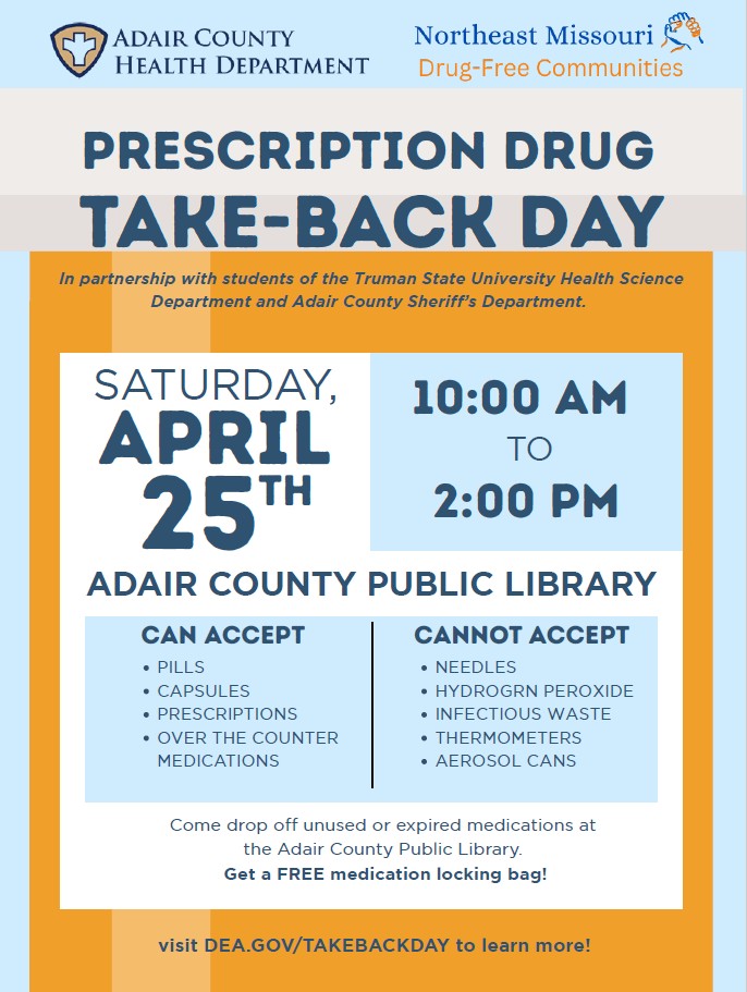 Community members are encouraged to safely dispose of unused or expired medications during the upcoming Prescription Drug Take-Back Day on Saturday, April 25, from 10:00 a.m. to 2:00 p.m. at the Adair County Public Library. Residents of Adair County and surrounding communities are invited to participate.