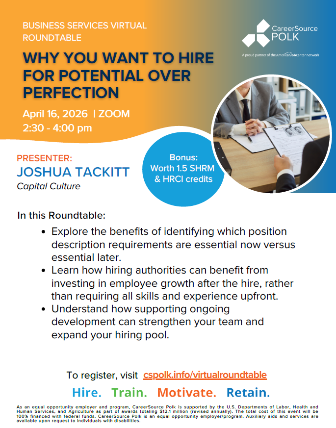 CareerSource Polk Virtual Roundtable - "Why You Want to Hire for Potential over Perfection" - Thursday, April 16th, 2:30 - 4 p.m. To register visit: https://www.careersourcepolk.com/events/virtual-roundtable-why-you-want-to-hire-for-potential-over-perfection/. Click HERE for the flyer and more info.