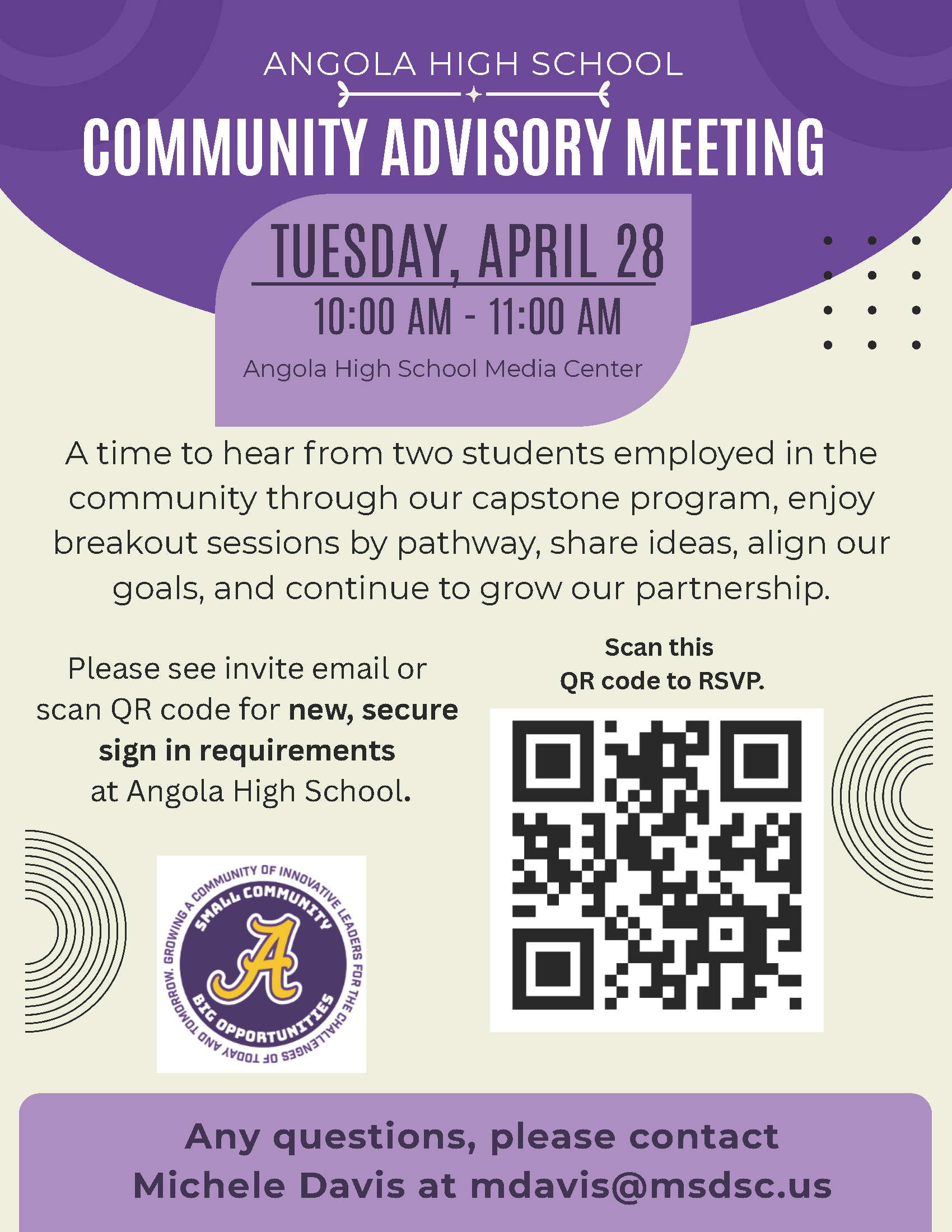 This meeting is taking place on Tuesday, April 28th from 10:00am - 11:00am at Angola High School.